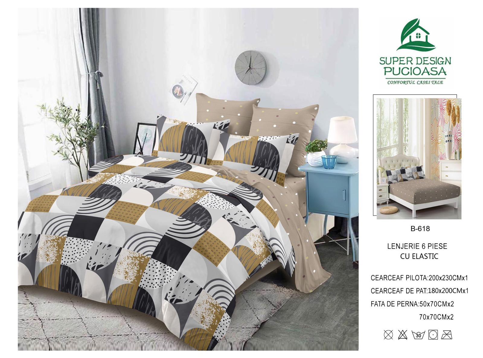 Lenjerie de pat dublu, Bumbac Finet, 6 piese cu elastic - LCE26